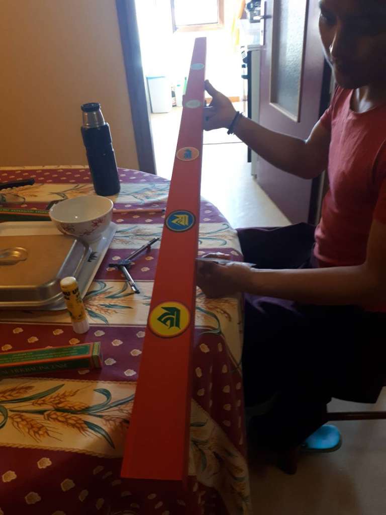 Le « remplissage » traditionnel d’un stoupa se fait avec d’autres substances et objets que les rouleaux de mantras. Lama Shérab Gyaltsen Rinpoché, depuis le Népal, nous guide et prépare lui-même certaines des substances. Au regard de la taille du stoupa, Rinpoché a lui-même recommandé, confectionné et consacré authentiquement le boumpa (vase) et l’ « arbre de vie » (sok shing), colonne vertébrale qui se placent à différents niveaux, au cœur du stoupa.