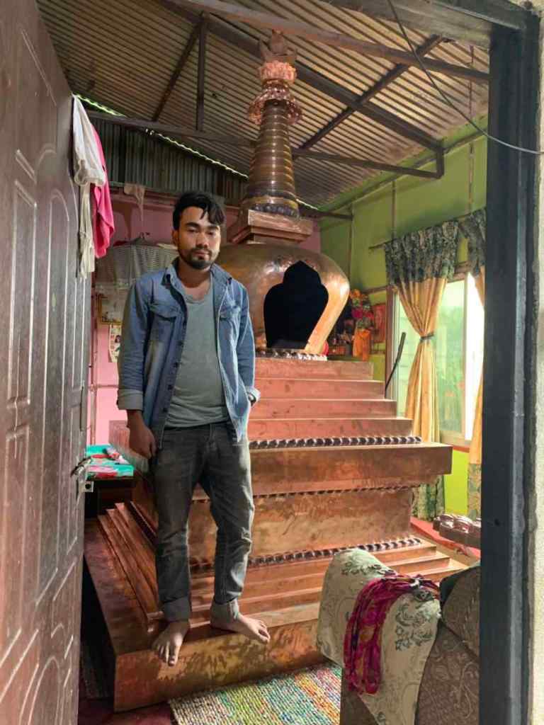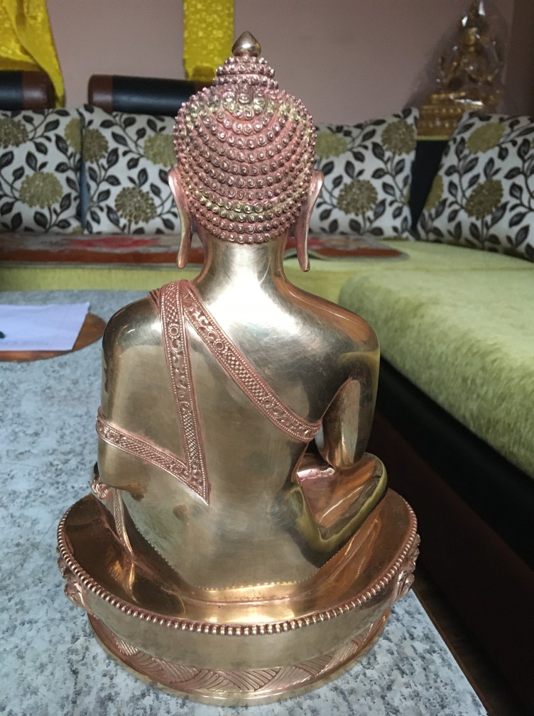 Dans la partie bombée, « boumpa » en tibétain ou « vase » en français, se trouve une fenêtre. Elle va accueillir une statue du Bouddha historique, Sakyamouni. Lors d’un précédent voyage en novembre 2018, Olivier avait rencontré un artisan népalais réputé pour la qualité de ses statues. Khamsum, à notre demande, a passé la commande. Cette statue mesure 33 cm. Il reste encore des finitions à réaliser.